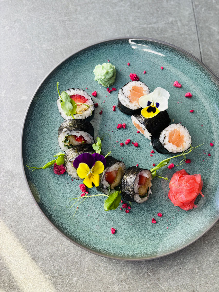 krémový syr, cuketa v panko strúhanke, lososový tatar s mangom a avokádom, furikake korenie