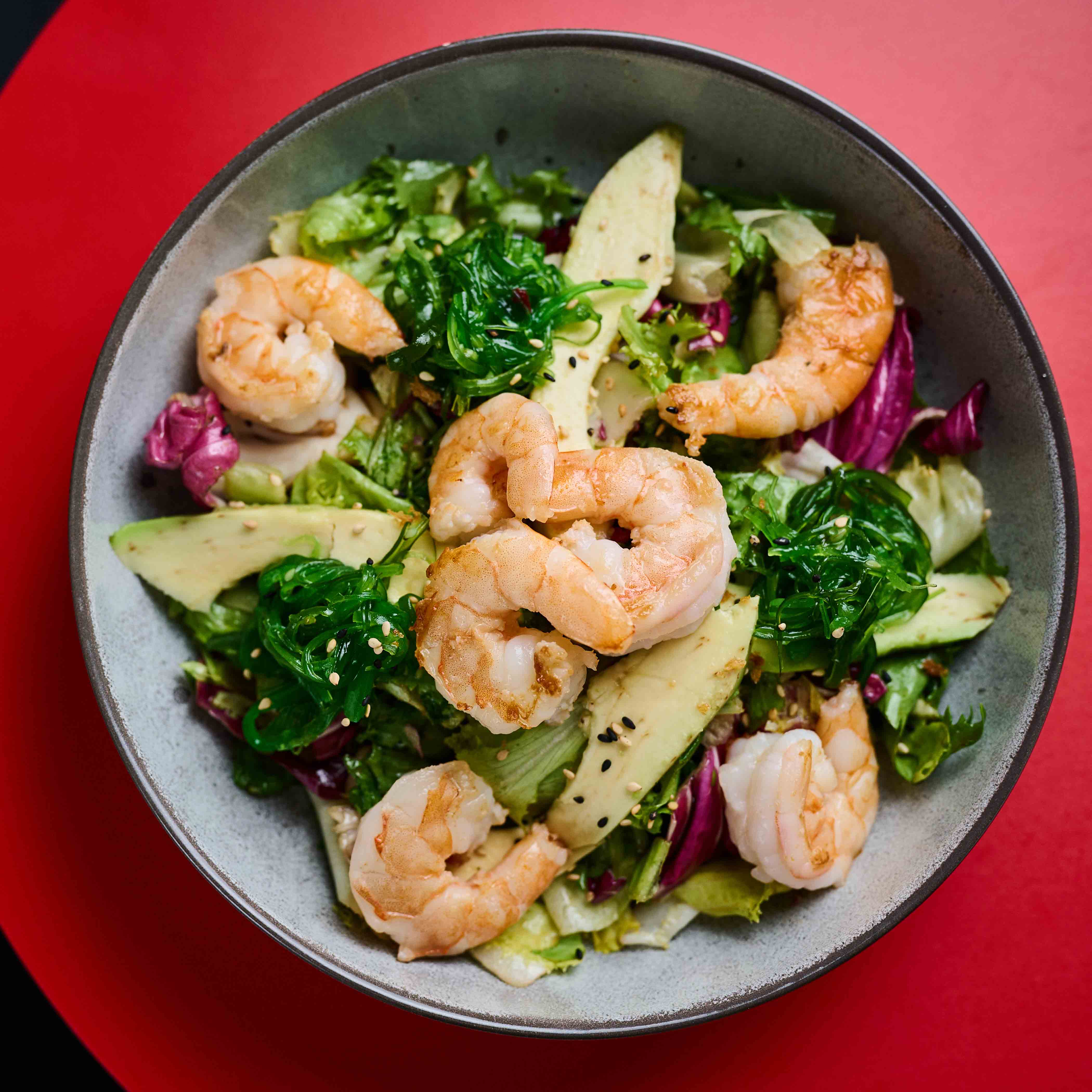 Miešaný listový šalát s wakame riasami, avokádo, sezam, ázijský dresing