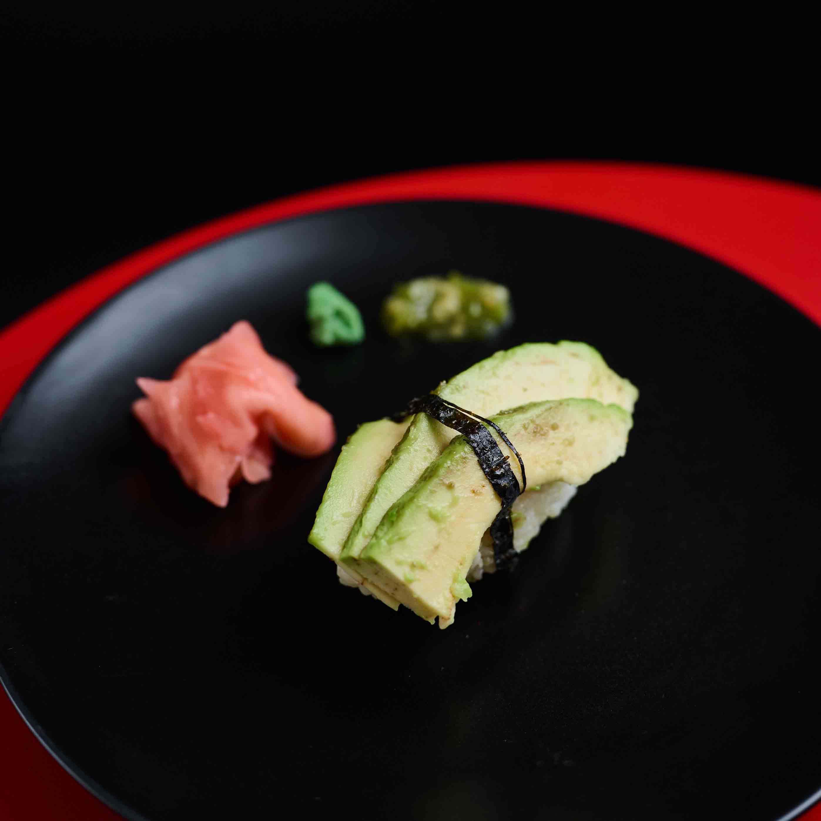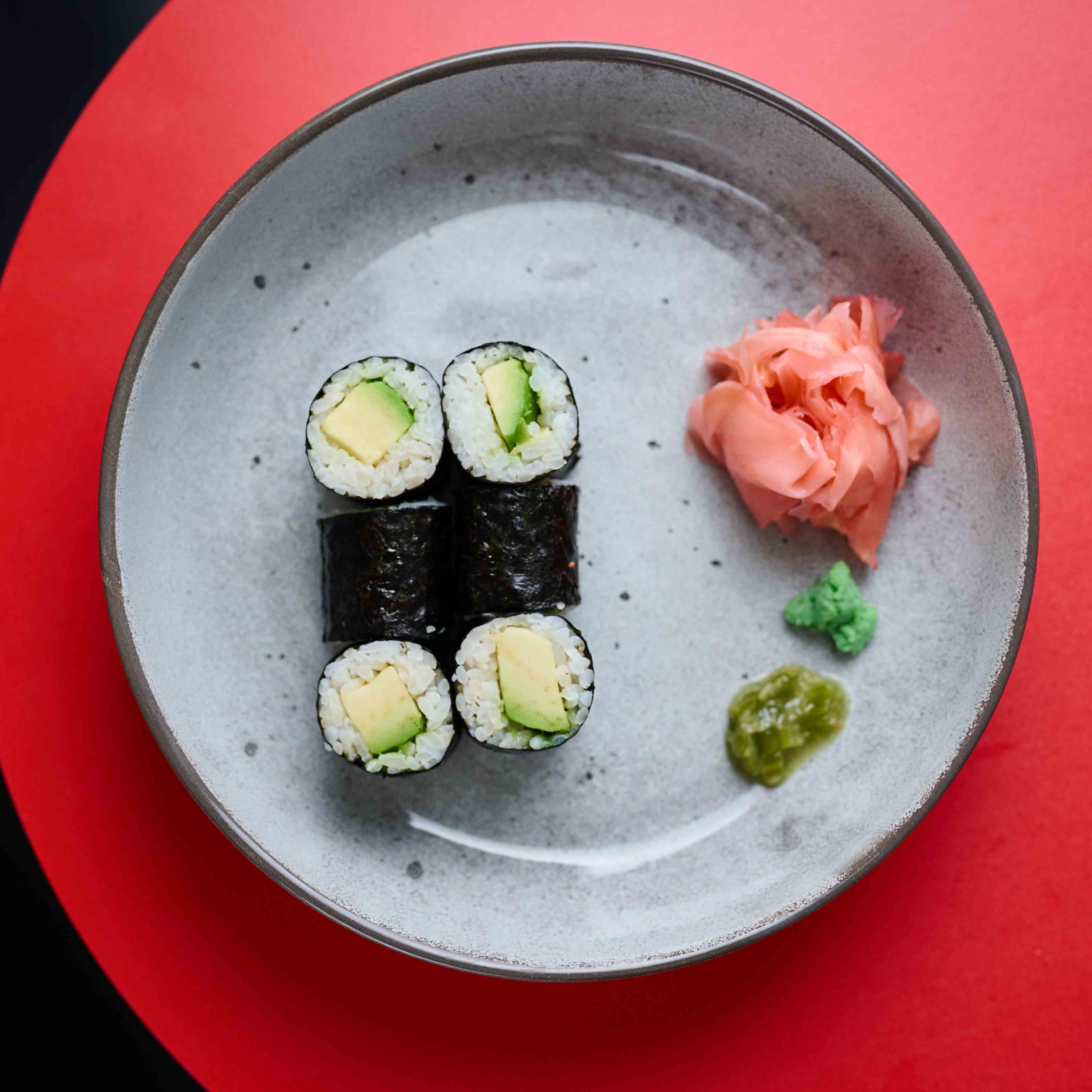 ryža, gaucamole, mkrva, edamove bôby, nakladaný zázvor, uhorka, majonéza