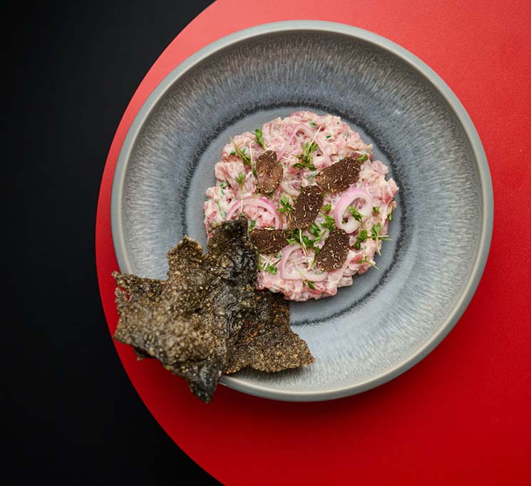 (Tuniakovi tatarák s hľuzovkou, guacamole, krevety v panko strúhanke, sezam)