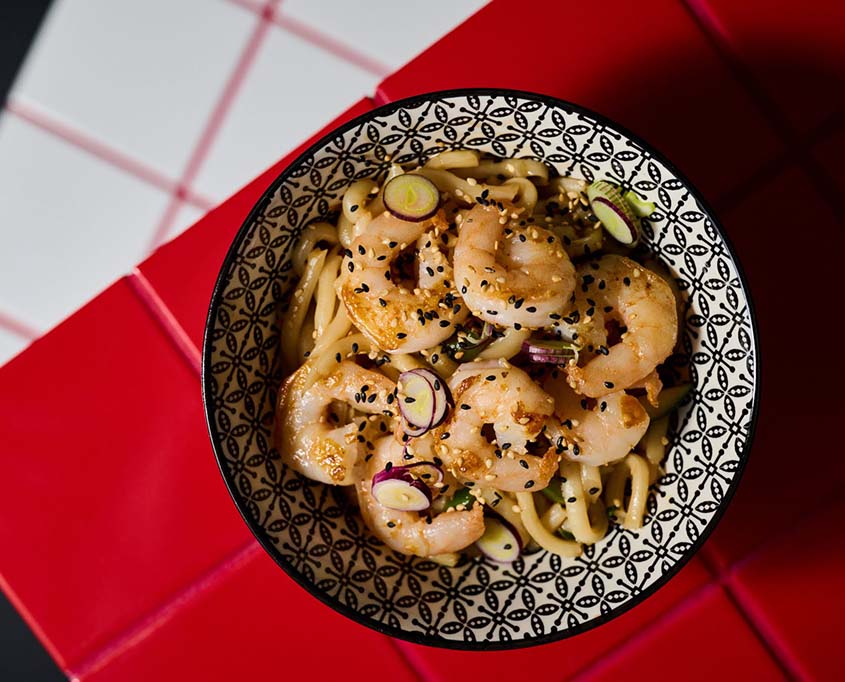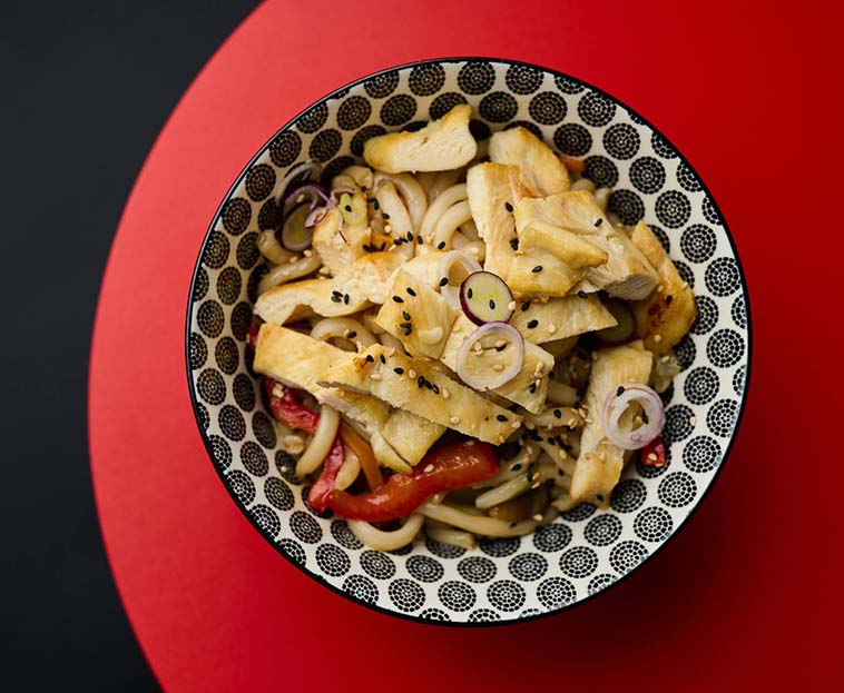 Udon rezance s maslovou miso pastou, shitake hubami, jarnou cibuľkou a kuraťom v panko strúhanke