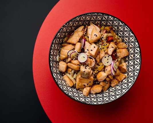 losos, uhorma, avokádo, unagi omáčka, pražená cibuľka, chilli majonéza, čerstvé chilli