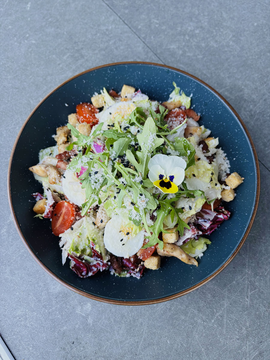 Cézar šalát s grilovaným kuracím mäsom (kuracie prsia, šalát, krutóny, parmezán, slanina a jogurto-horčicový dresing) + polievka