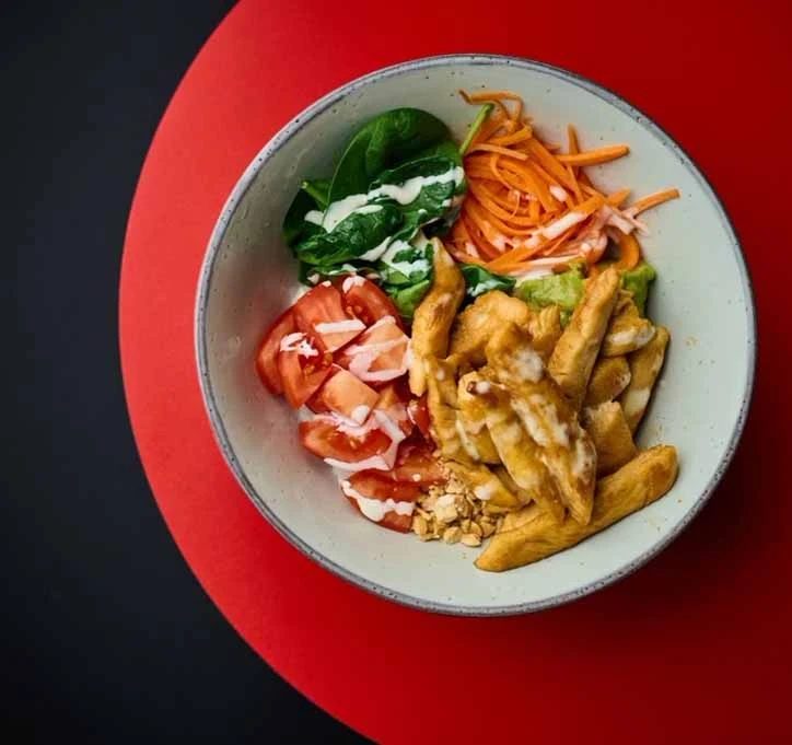 Poke hlivové krídelká (vyprážaná hliva, ryža, edamame, mrkva, uhorka, nakladaná redkvička, quacamole a spicy mayo) + polievka