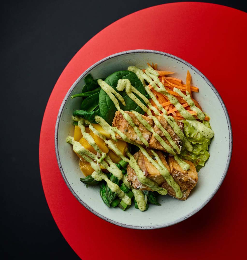 tuniak, losos, kreveta, ryžové rezance, čerstvá zelenina, korialdrový olej