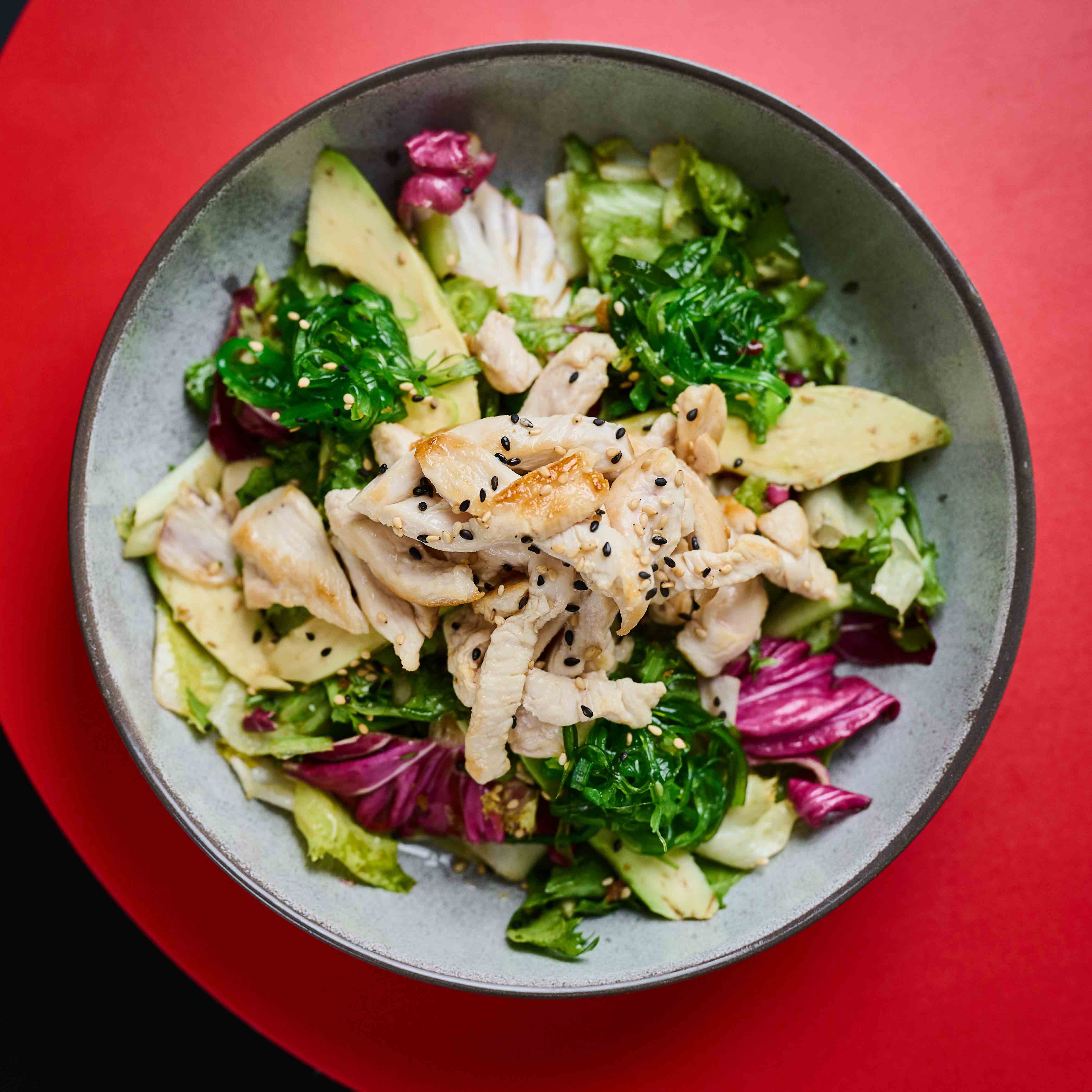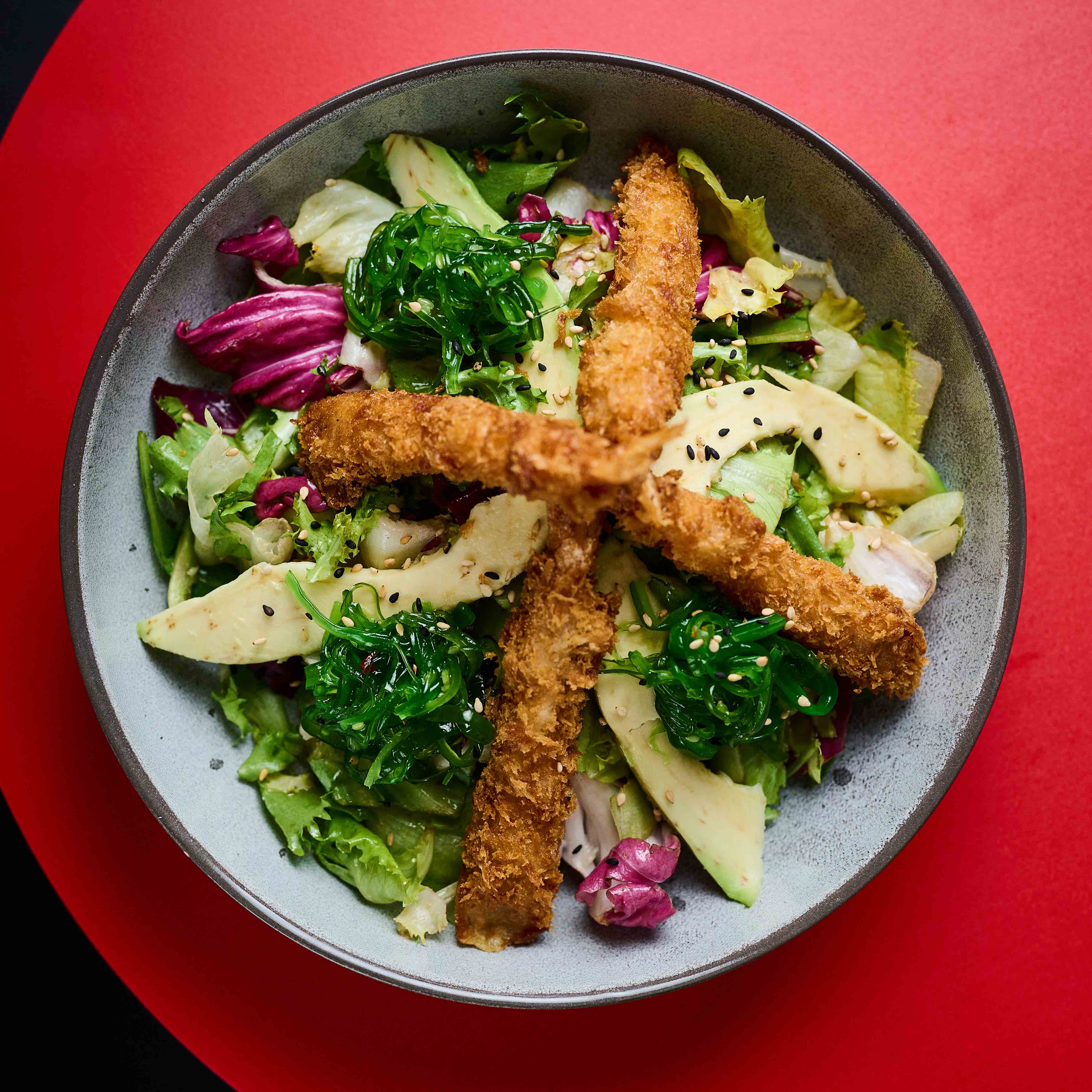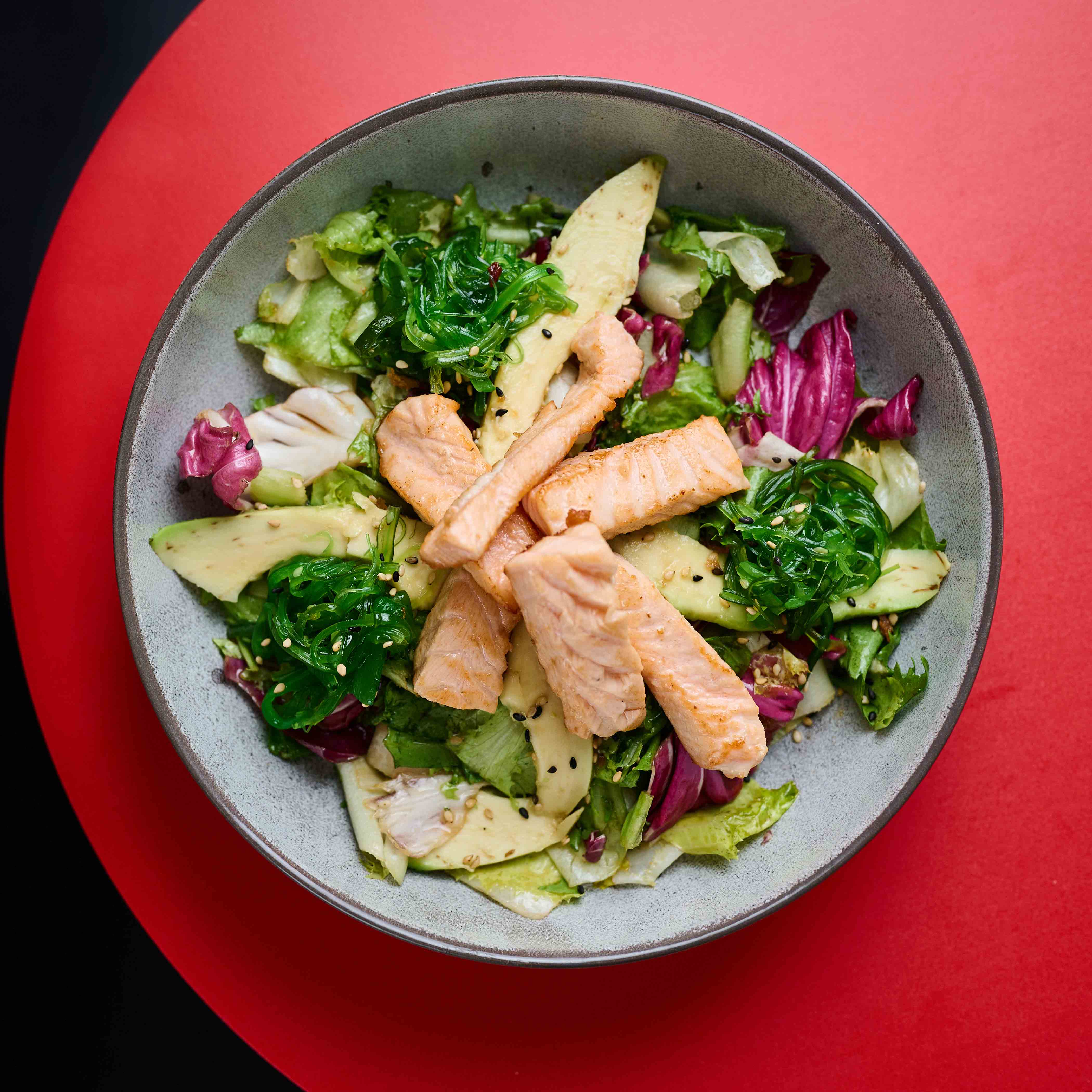 Miešaný listový šalát s wakame riasami, avokádo, sezam, ázijský dresing