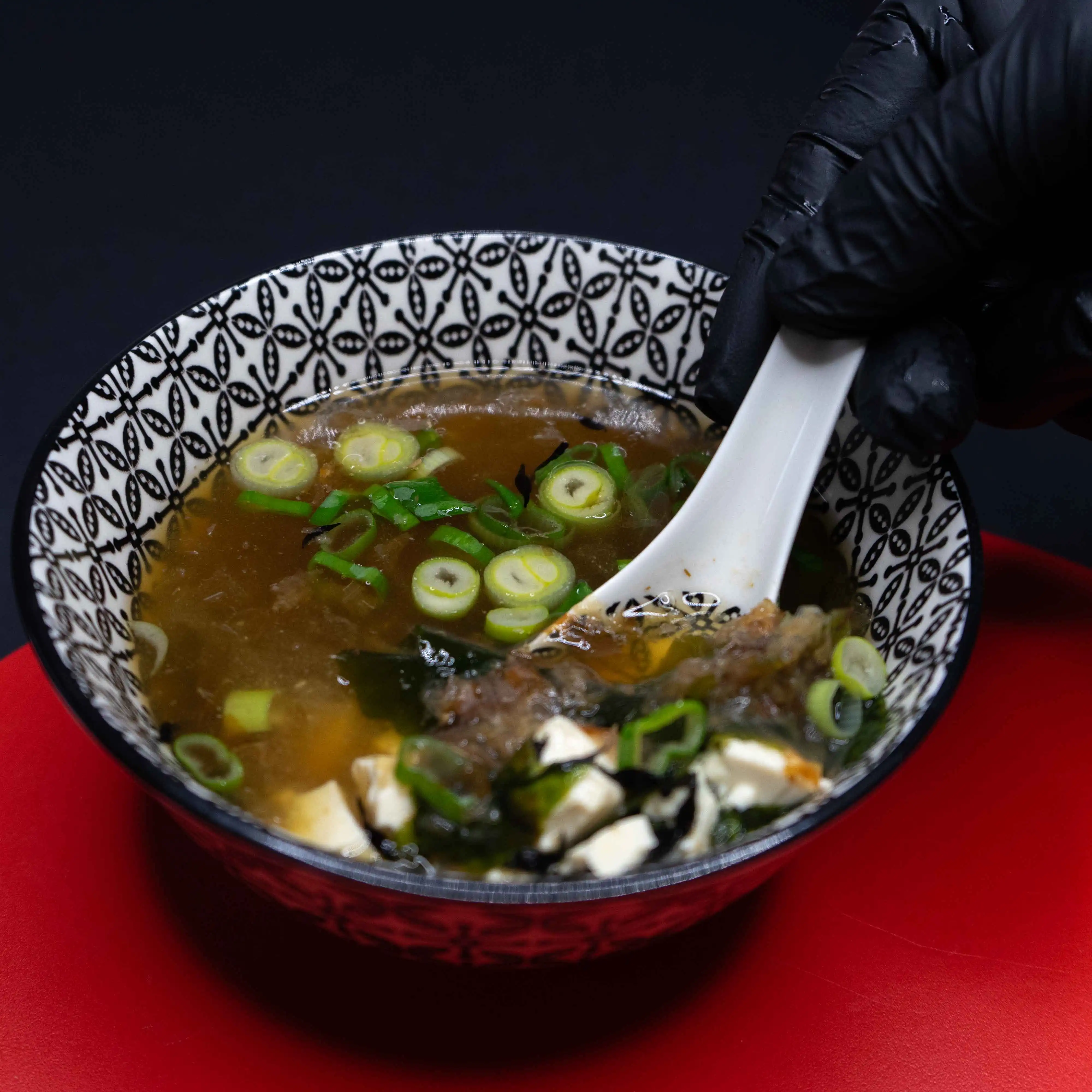 miso pasta, wakame riasy, hijiky riasy, jemné tofu, jarná cibuľka, sušený tuniak